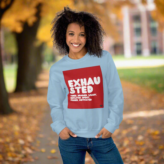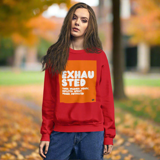 Exhausted in Red and White Unisex Crew Neck Sweatshirt - Available in Assorted Colors