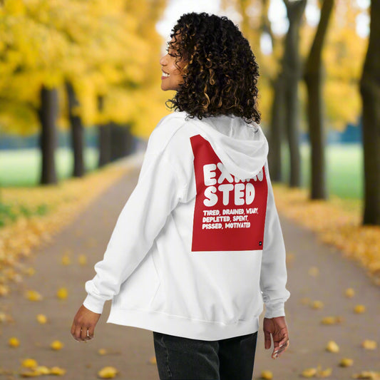 Exhausted in Red and White Unisex Zip-Up Hoodie - Available in Assorted Colors
