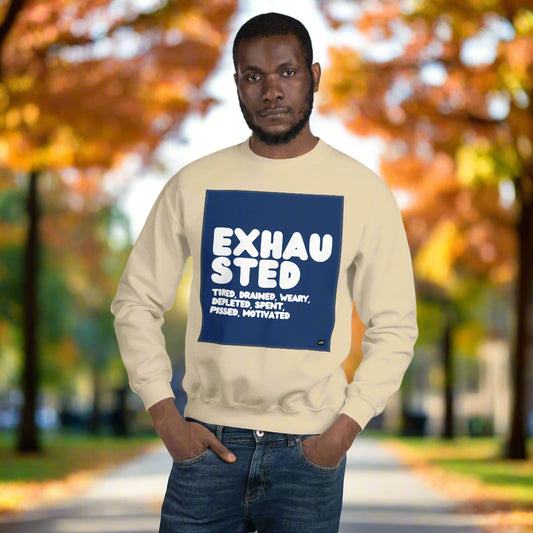 Exhausted in Blue and White Unisex Crew Neck Sweatshirt - Available in Assorted Colors