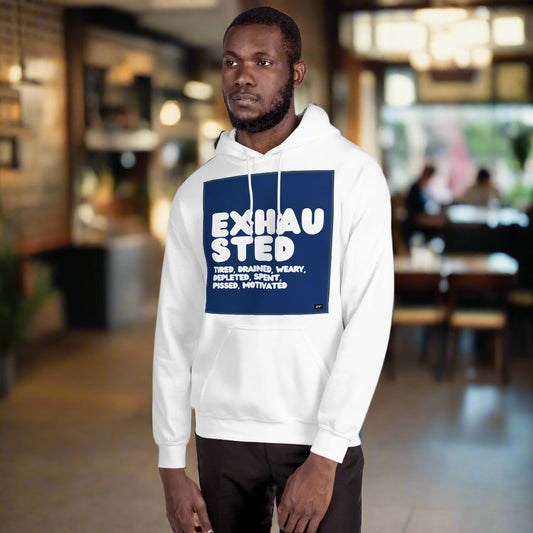 Exhausted in Blue and White Unisex Hoodie - Available in Assorted Colors