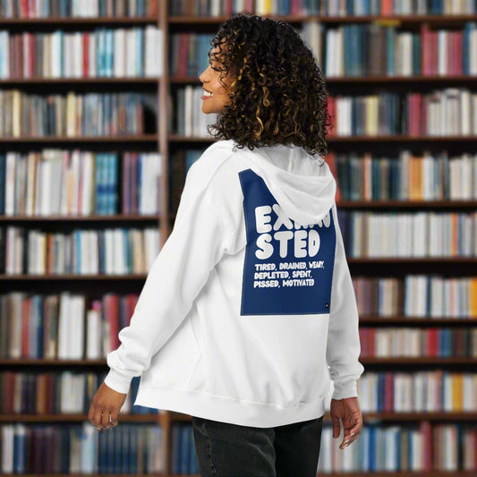 Exhausted in Blue and White Unisex Zip-Up Hoodie - Available in Assorted Colors