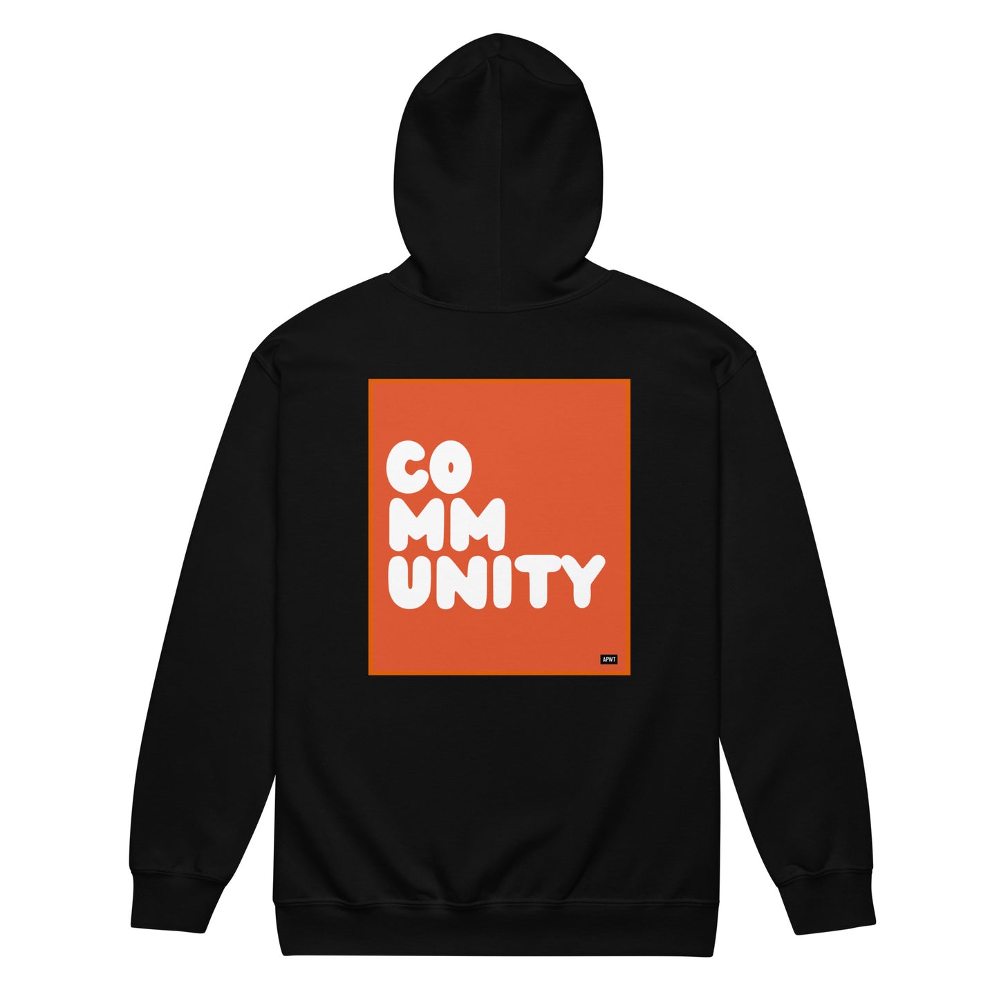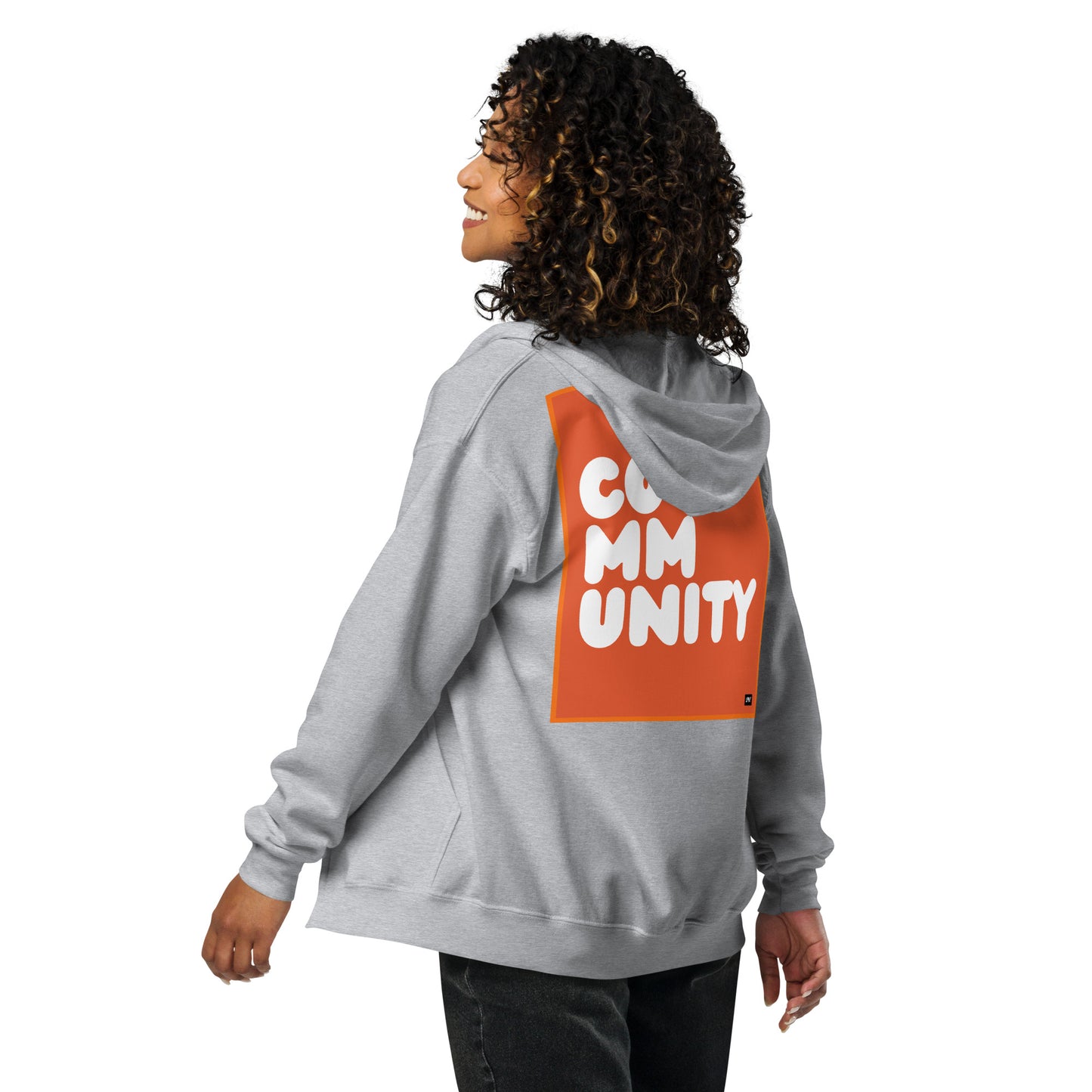 Sweatshirt Brand: A Community in Tangerine Unisex Zip-Up Hoodie is printed on a Gildan brand sweatshirt.