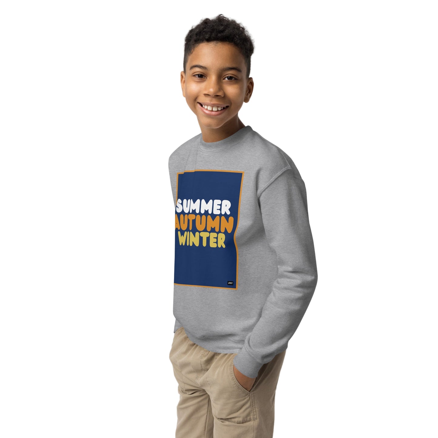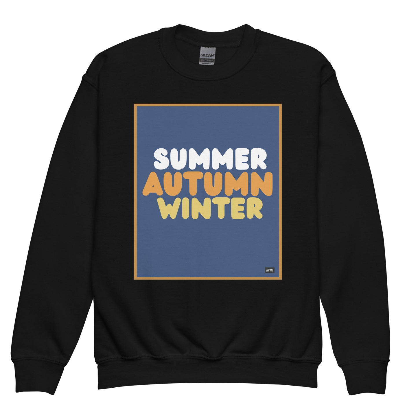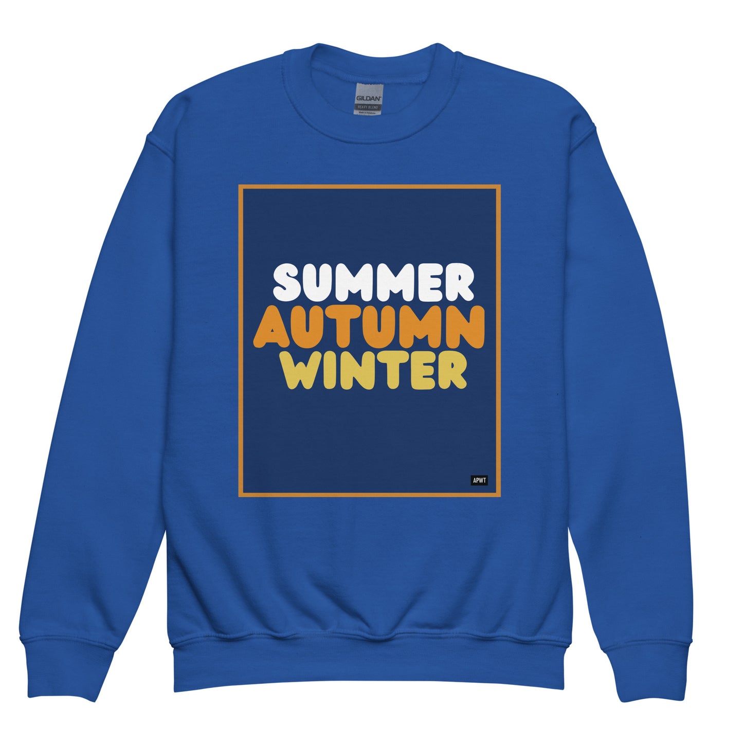 Introducing the Autumn Kids in Blue Unisex Crew Neck Sweatshirt, from the Fall in the APWT Gift Shop Collection and the APWT Kid's Shop. Featuring a fun fall-inspired design, this cozy sweatshirt is perfect for embracing the changing season. Available in assorted colors in youth sizes XS-XL, it offers both style and warmth for cooler days. Whether as an extra layer or a foundational piece, this sweatshirt helps your child stay snug while celebrating the spirit of autumn.