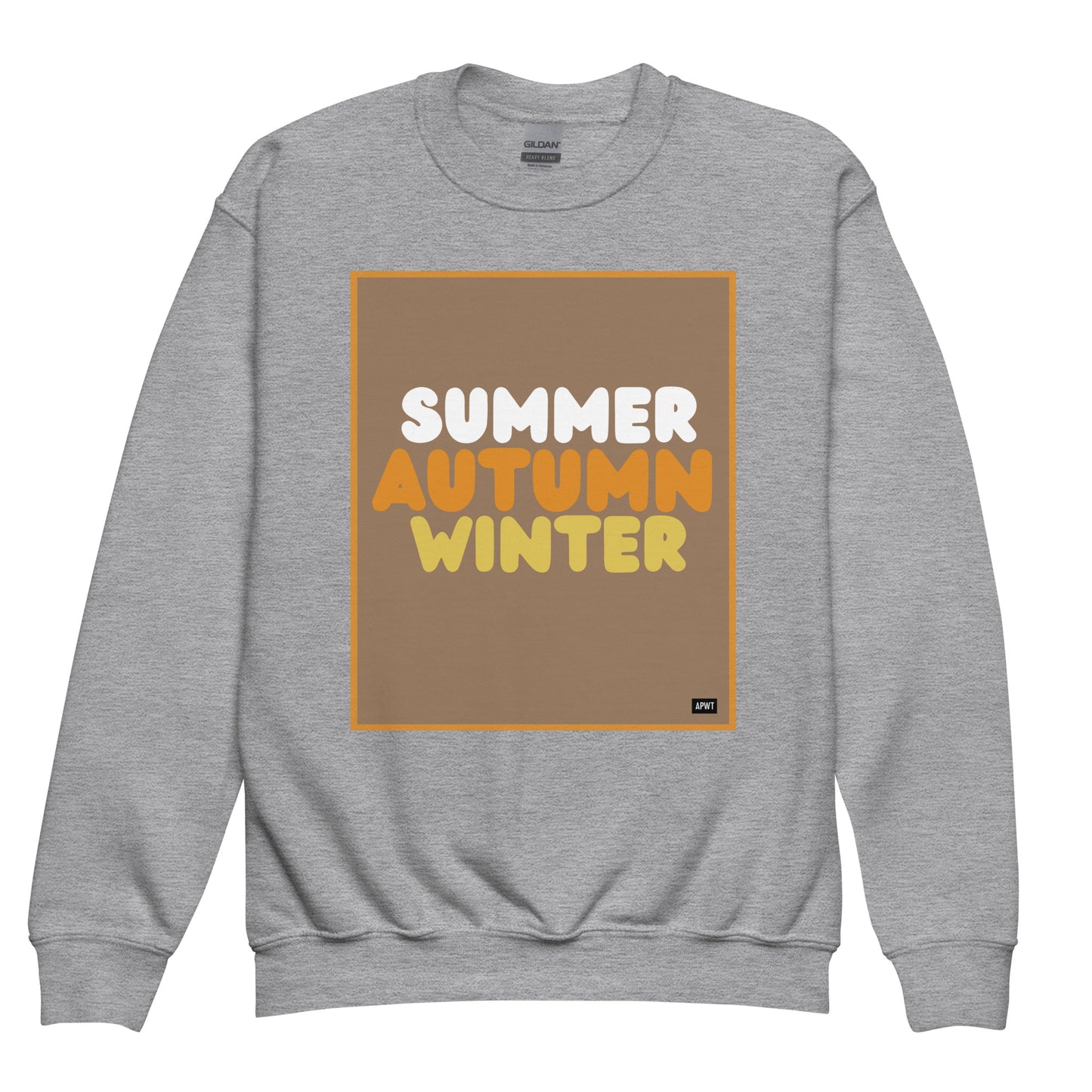 Sweatshirt Brand: The Autumn Kids in Brown Unisex Crew Neck Sweatshirt is printed on a Gildan brand sweatshirt.