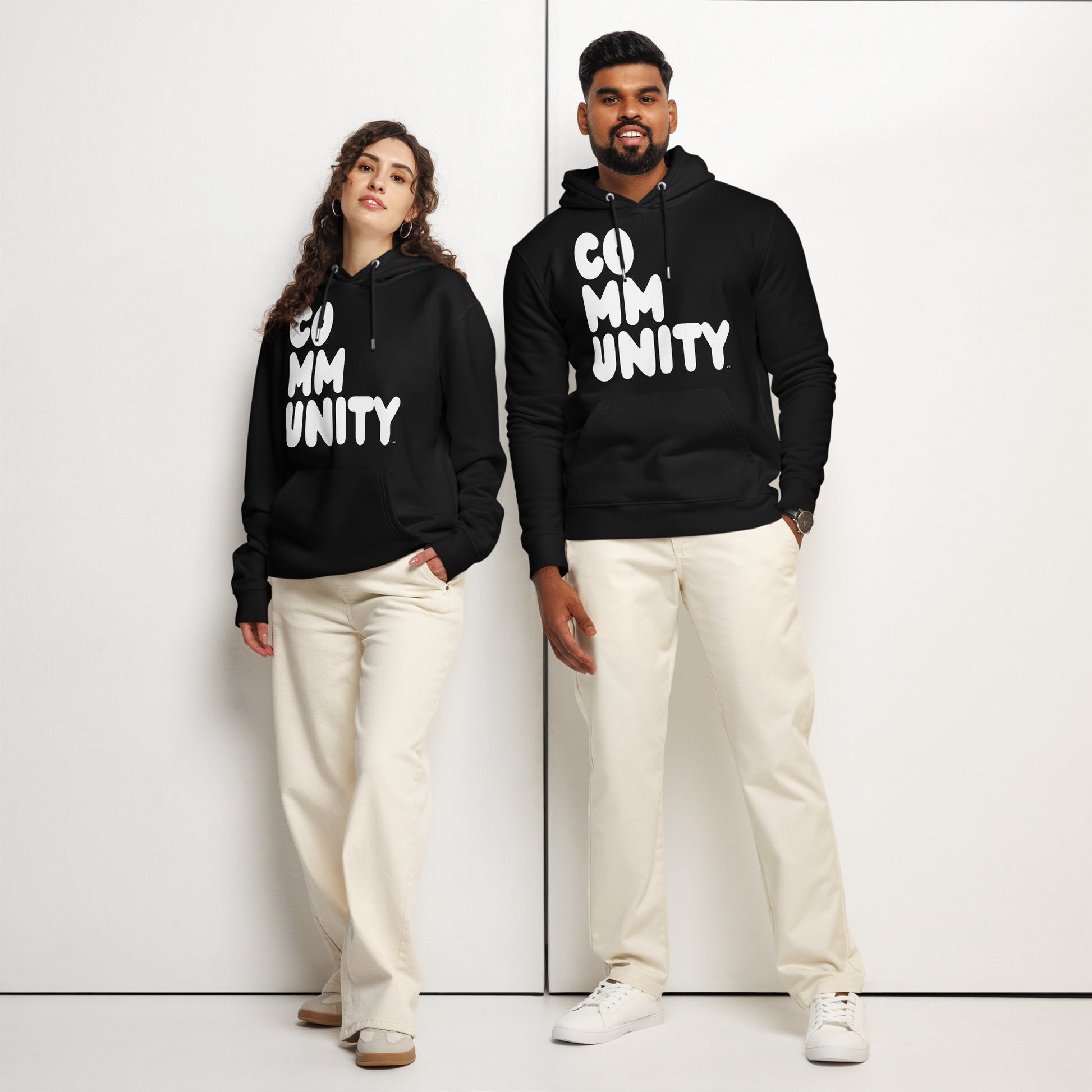 Sweatshirt Brand: The Community in Black and White Premium Unisex Hoodie is printed on a Stanley/Stella brand sweatshirt.
