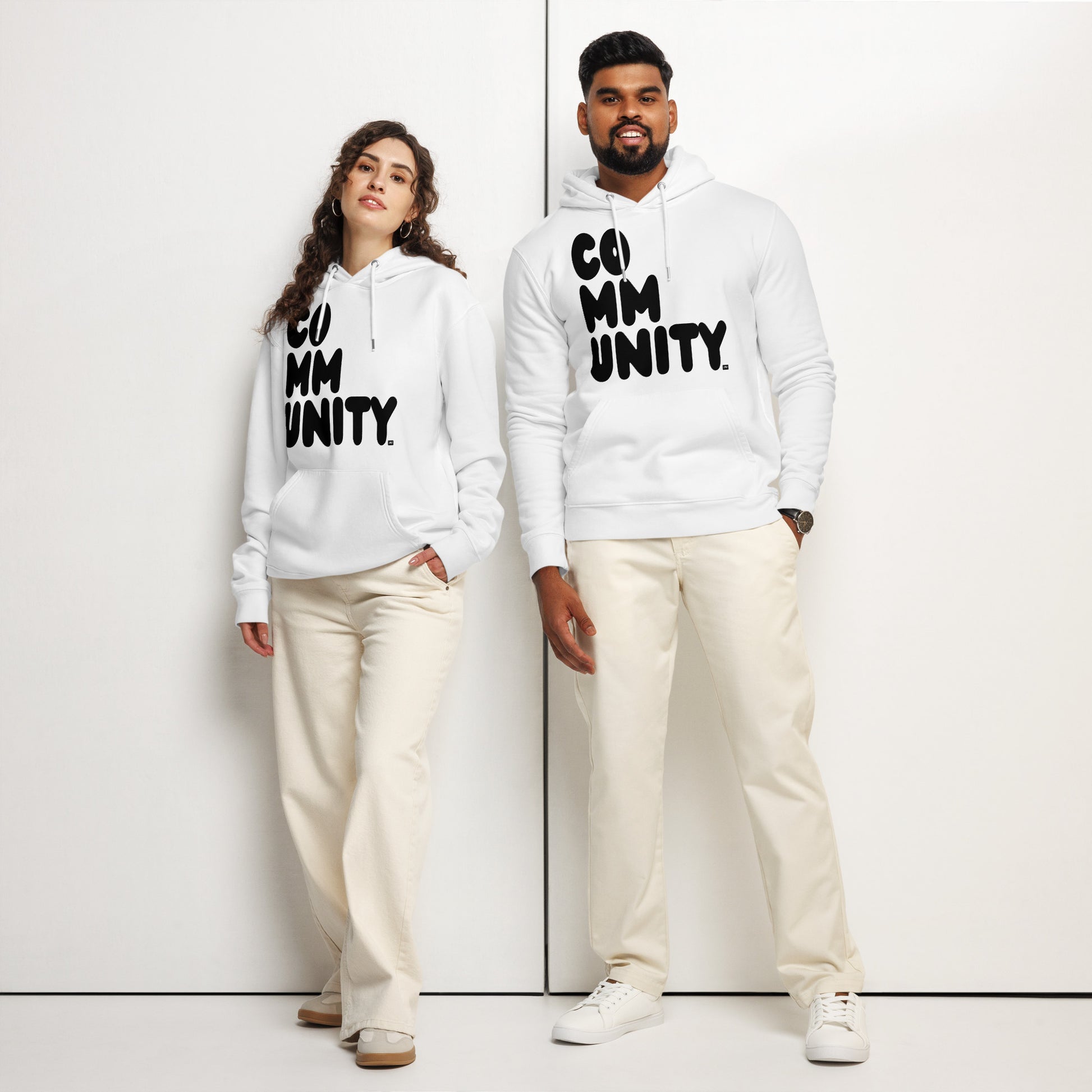 Sweatshirt Brand: The Community in Black and White Premium Unisex White Hoodie is printed on a Stanley/Stella brand sweatshirt.