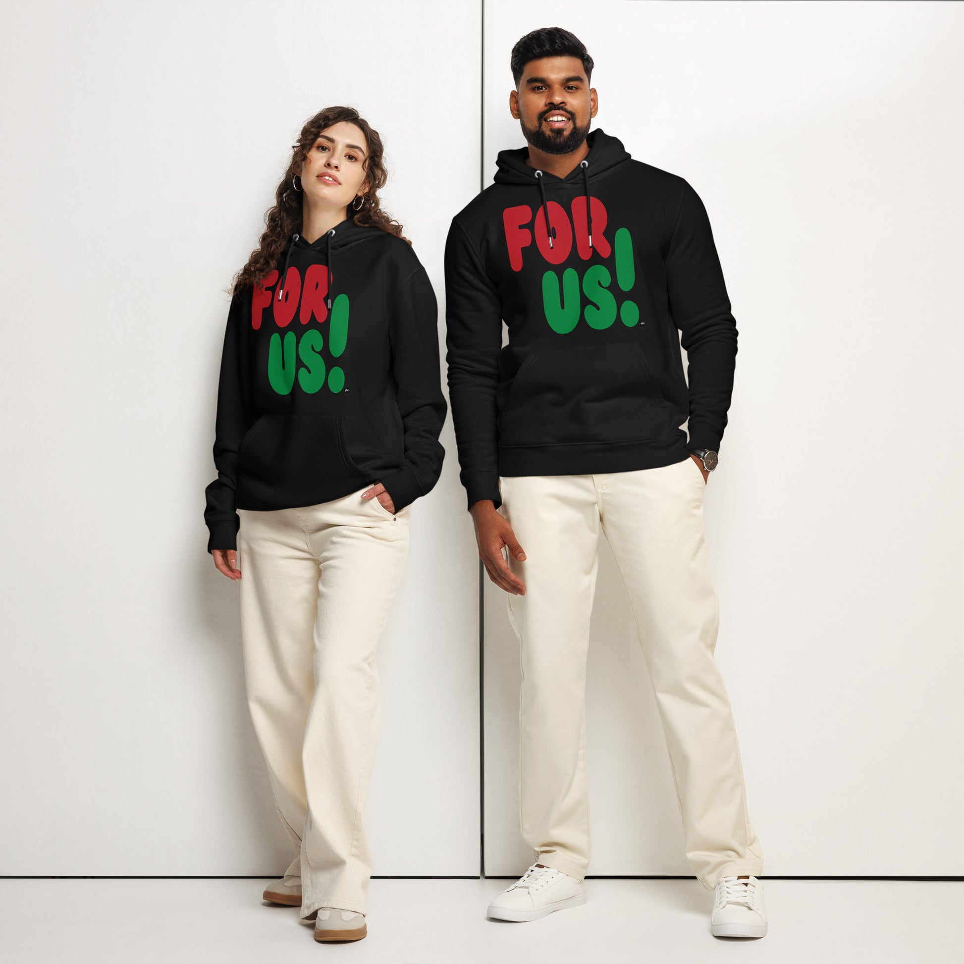 Promote community and connection in our For Us in Black Premium Unisex Hoodie, from our For Us Collection and our Black Collection. Made from 80% organic cotton and 20% recycled polyester, this hoodie combines comfort with sustainability. Its bold red, black, and green design is a tribute to Black People and Black Culture, while promoting a message of collective well-being. Available in sizes S-3XL, it’s a powerful, stylish way to express pride and unity wherever you go.