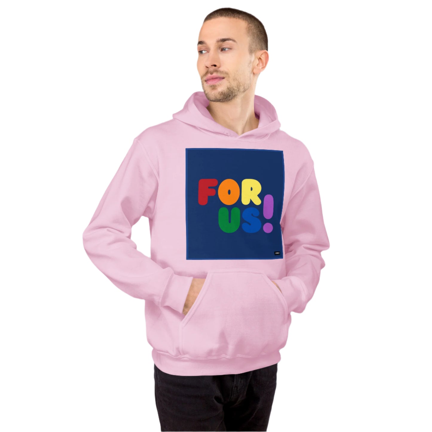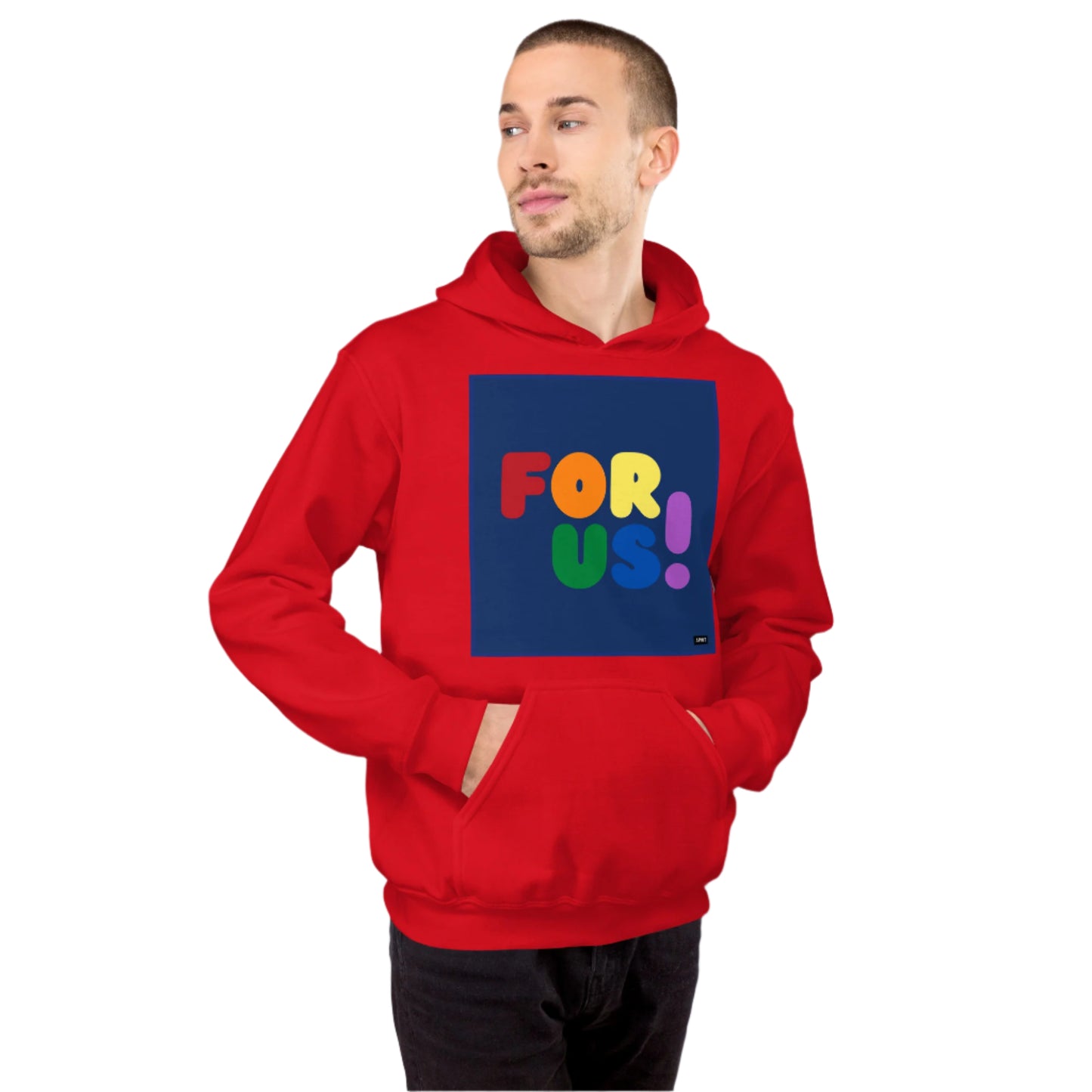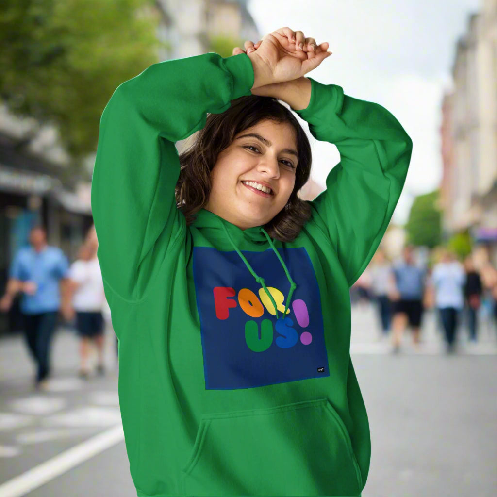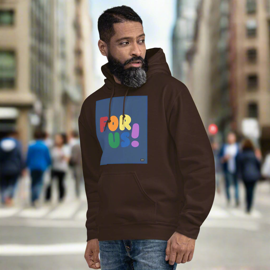 The Rainbow For Us Unisex Hoodie from our For Us Collection showcases our message in the colors of the LGBTQ+ Pride Flag, making a statement of inclusivity and community. Wear it with pride or in solidarity, this hoodie is a stylish and meaningful addition to your wardrobe.
