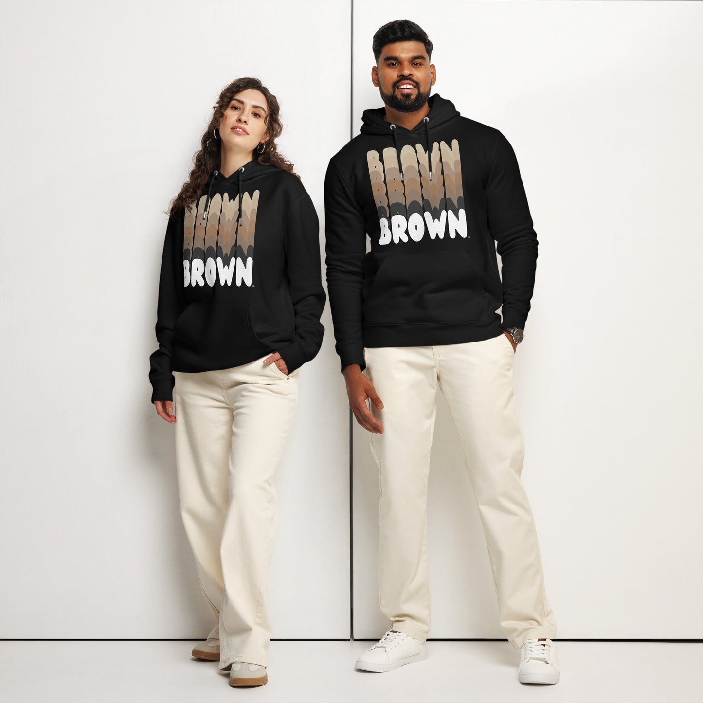 The Shades in Brown Premium Unisex Hoodie from our Brown Collection, celebrates the rich diversity and culture within the Brown Community. Made from 80% organic cotton and 20% recycled polyester, this hoodie offers style and comfort while promoting a powerful message of pride and solidarity. Available in black and navy blue, in sizes S-3XL, this sweatshirt is warm, with a fun retro-inspired design, making it a fashionable and meaningful addition to your wardrobe.