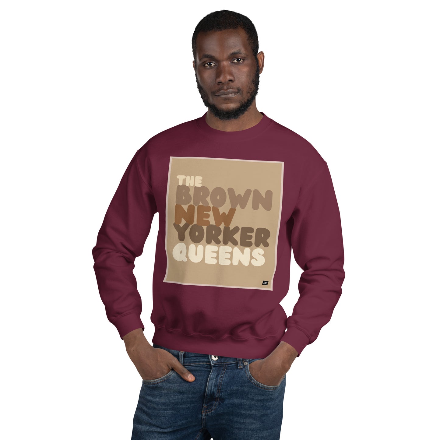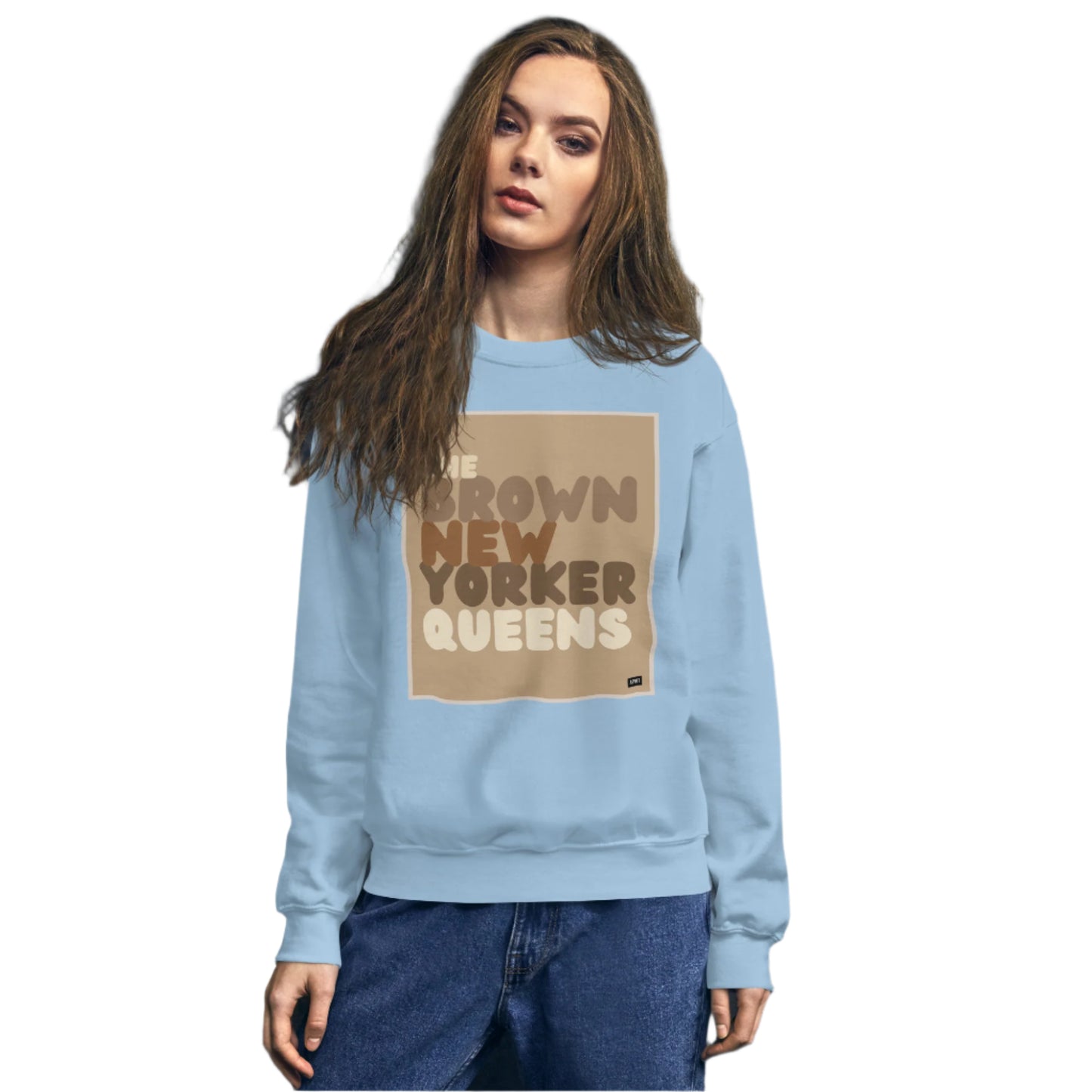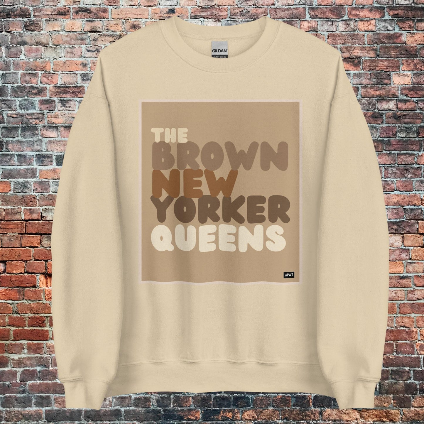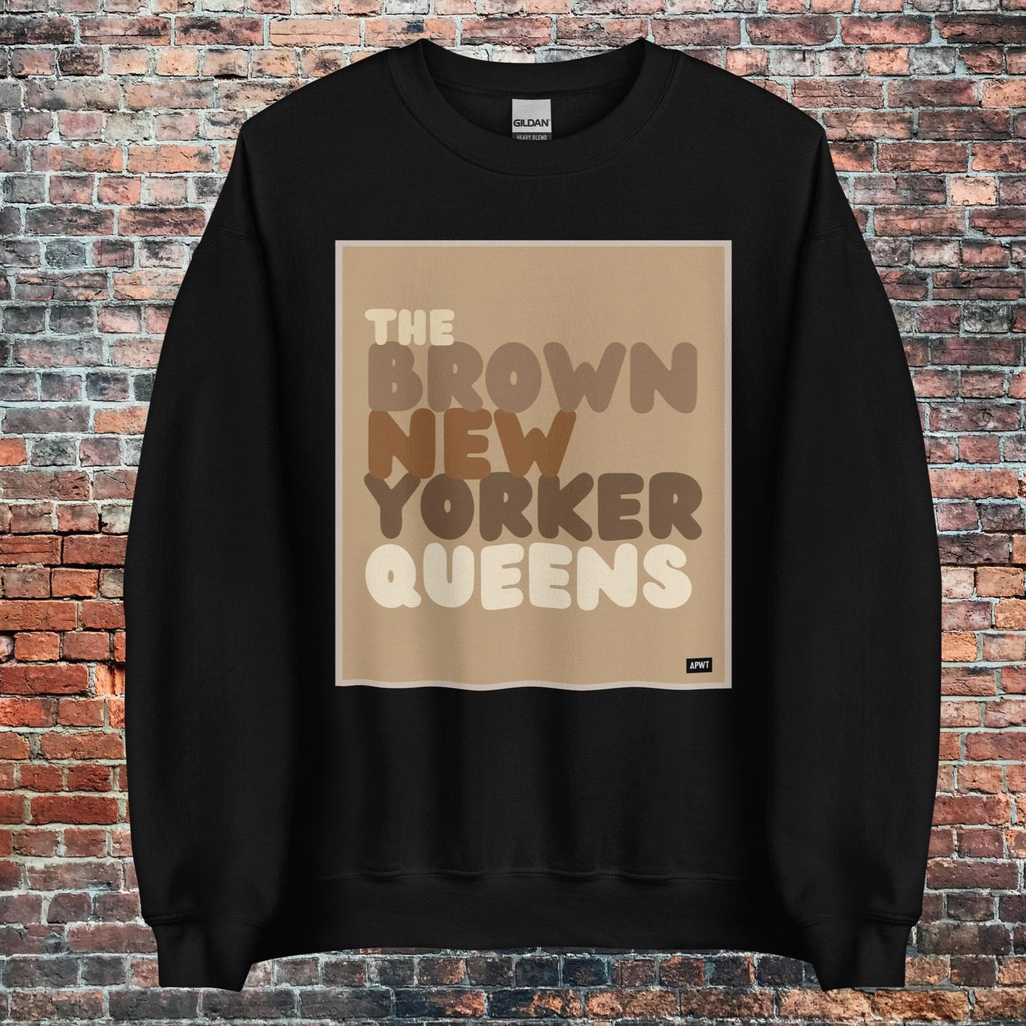 Design: The Brown New Yorker Queens Unisex Crew Neck Sweatshirt image is an original design by the APWT Design Team. The color combinations, image size, and sweatshirt fit were selected and designed to showcase the image but also be fun and stylish.